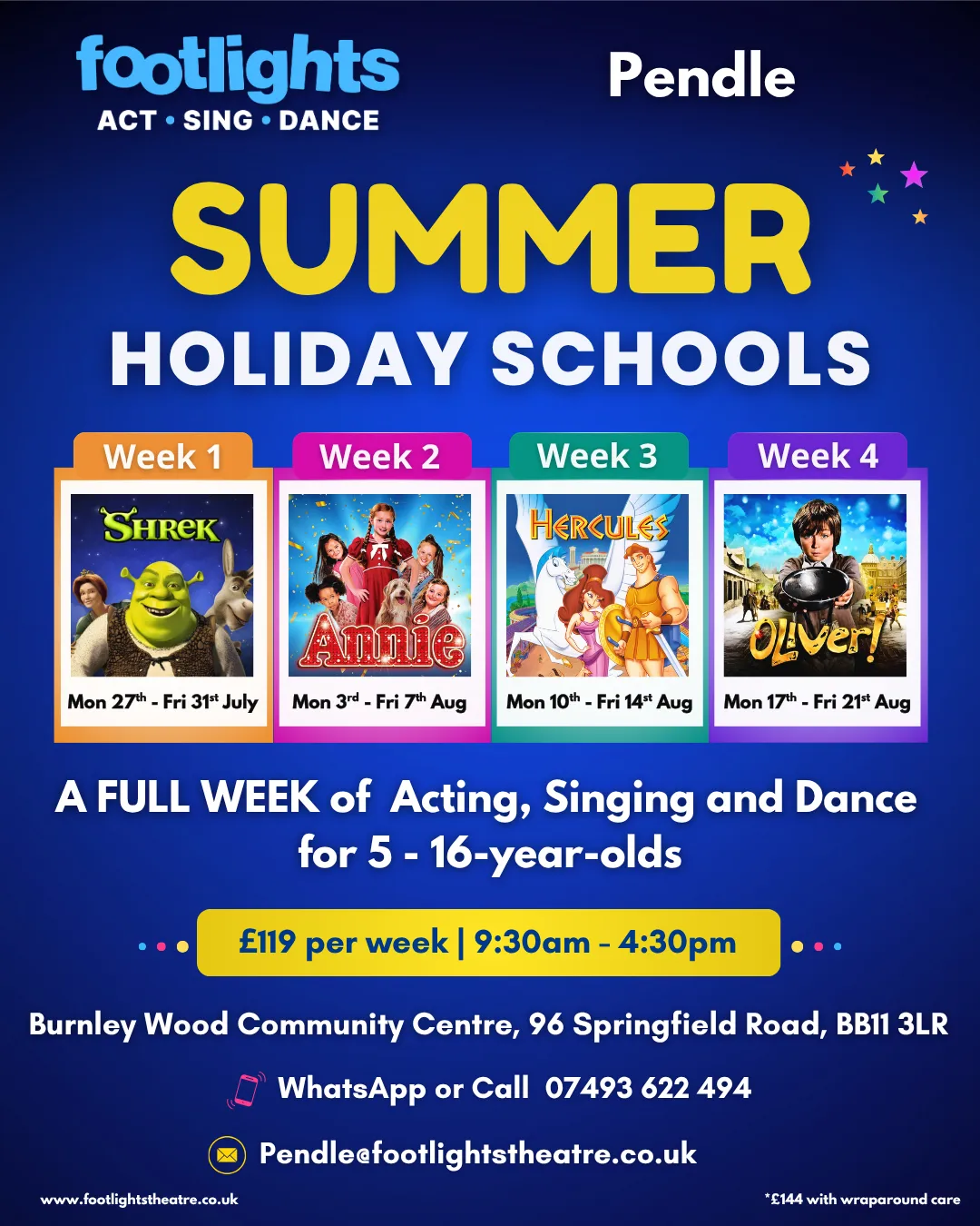A full week of acting, singing and dance for ages 5–16.