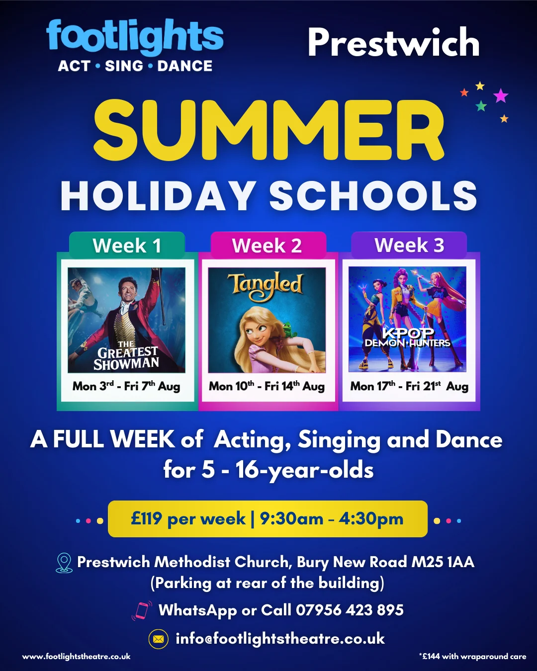 A full week of acting, singing and dance for ages 5–16.